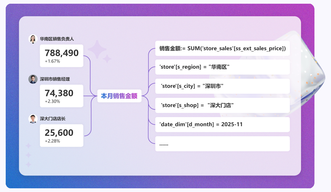 支持指标语义层的行列级权限设置,不同角色、不同层级的用户只能访问其权限范围内的数据。